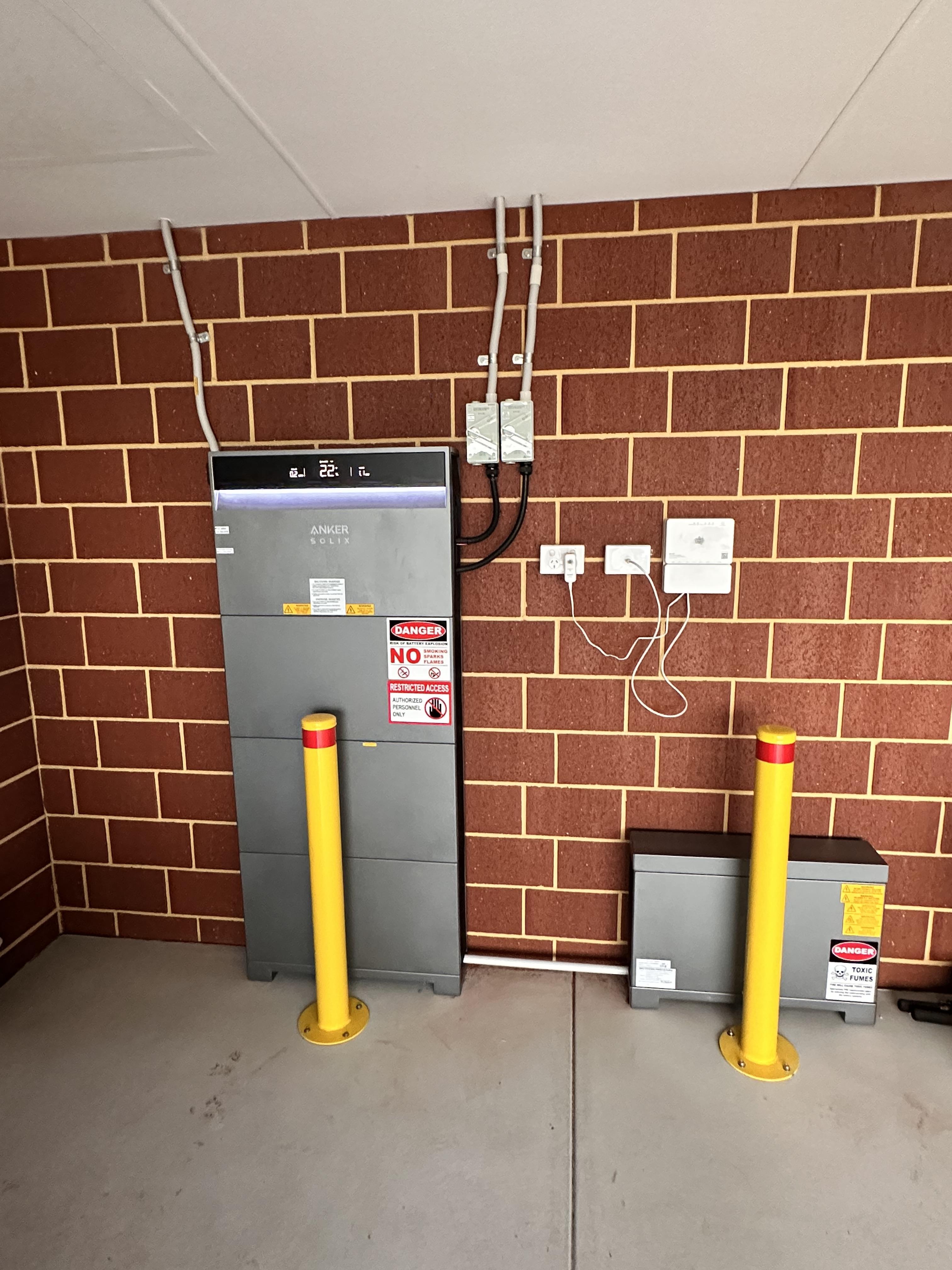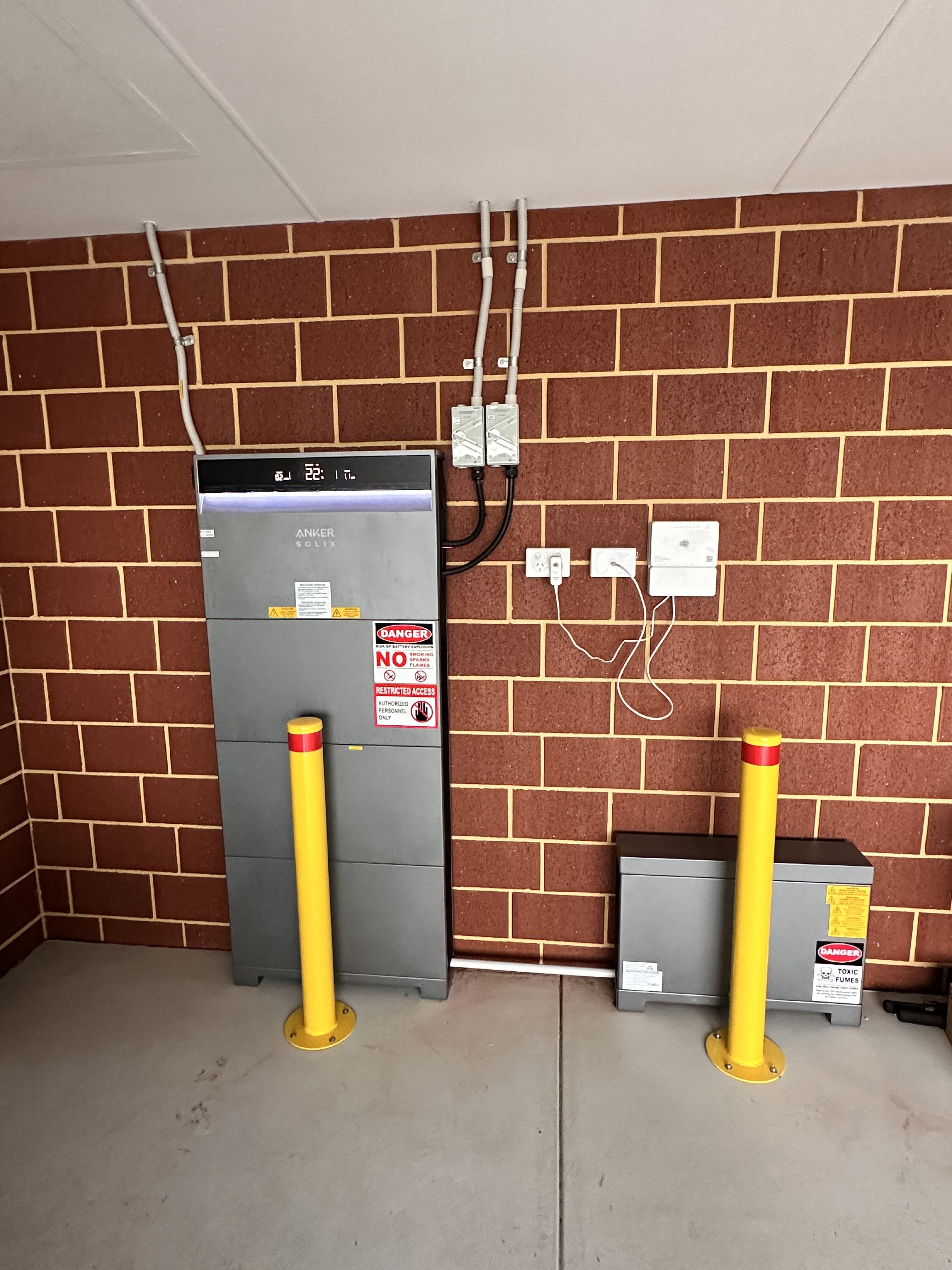 This is a beautiful looking system, powder coated metal with rigid plastic vents on the sides. It is very thin and fits well up against the wall. Wall mounted was an option and essential to keep off uneven ground. Up to four, 5kWh modules can be stacked with an inverter on top. This is a Hybrid inverter, which appears to be able to have a further set of solar panels added later if desired (2 MPPT's so two strings possible), which would make apocalypse proof battery backup if ever needed.