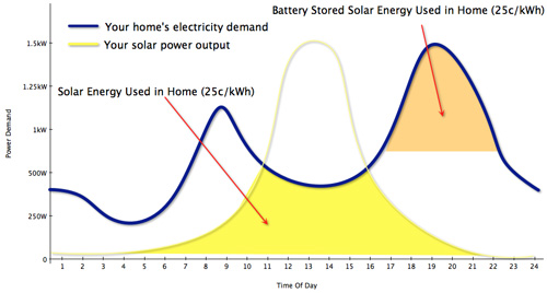 Time of use electricity tariffs which charge different amounts per kWh depending on the time of day, can vary from about 12c per kWh at night to around 50c per kWh in the afternoon. If you have a bank of batteries and some smart electronics (you don’t even need any solar panels!) then you can buy electricity when it is cheap and sell it when it is expensive. Hmmmm, that’s got you thinking hasn’t it!